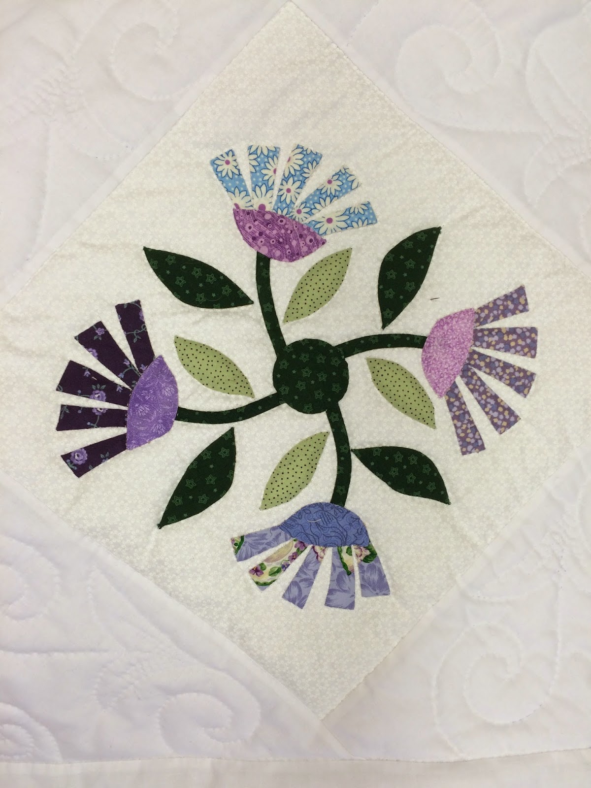 We had a great Show and Tell this week from one of our students in Peggy's Open Sew class. Liz had started creating several floral motif applique blocks as a beginning project for her first adventure into hand applique. Unfortunately, she had all these beautiful blocks but had no idea how to arrange them into an attractive and unified quilt.